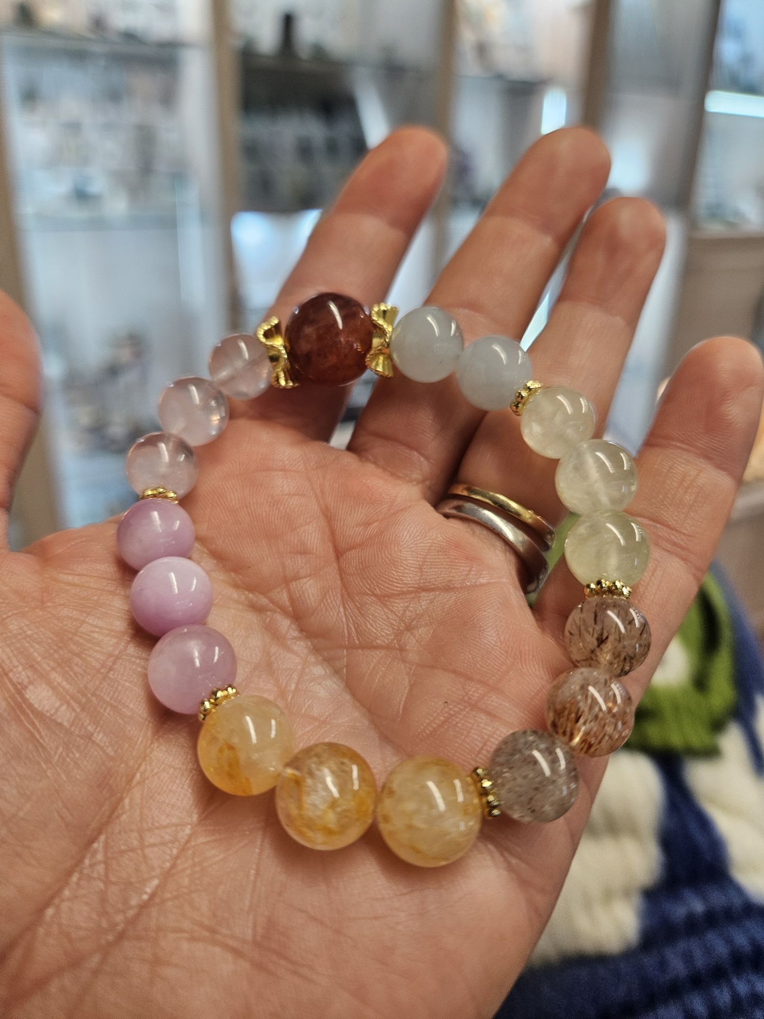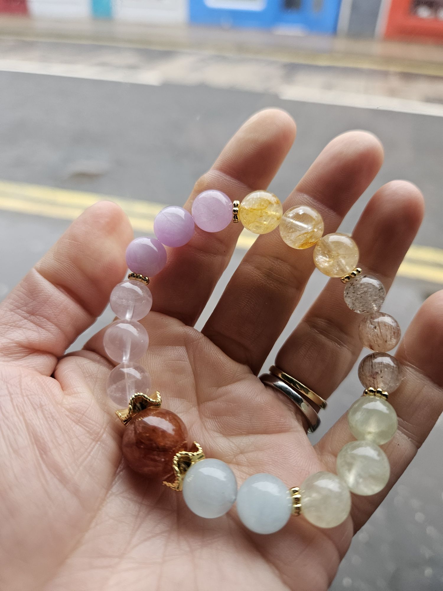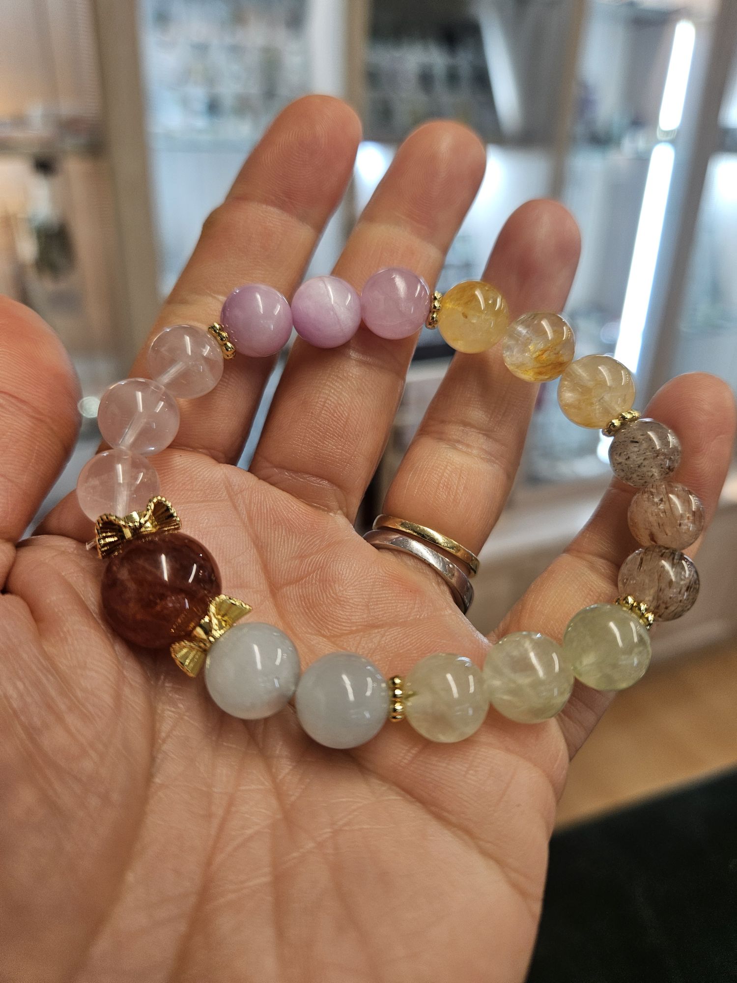 Consisting of 9 to 10mm beads using Aquamarine, Peridot, black Super Seven, Citrine, Kunzite, Rose Quartz and a 13mm red Hematoid quartz.
