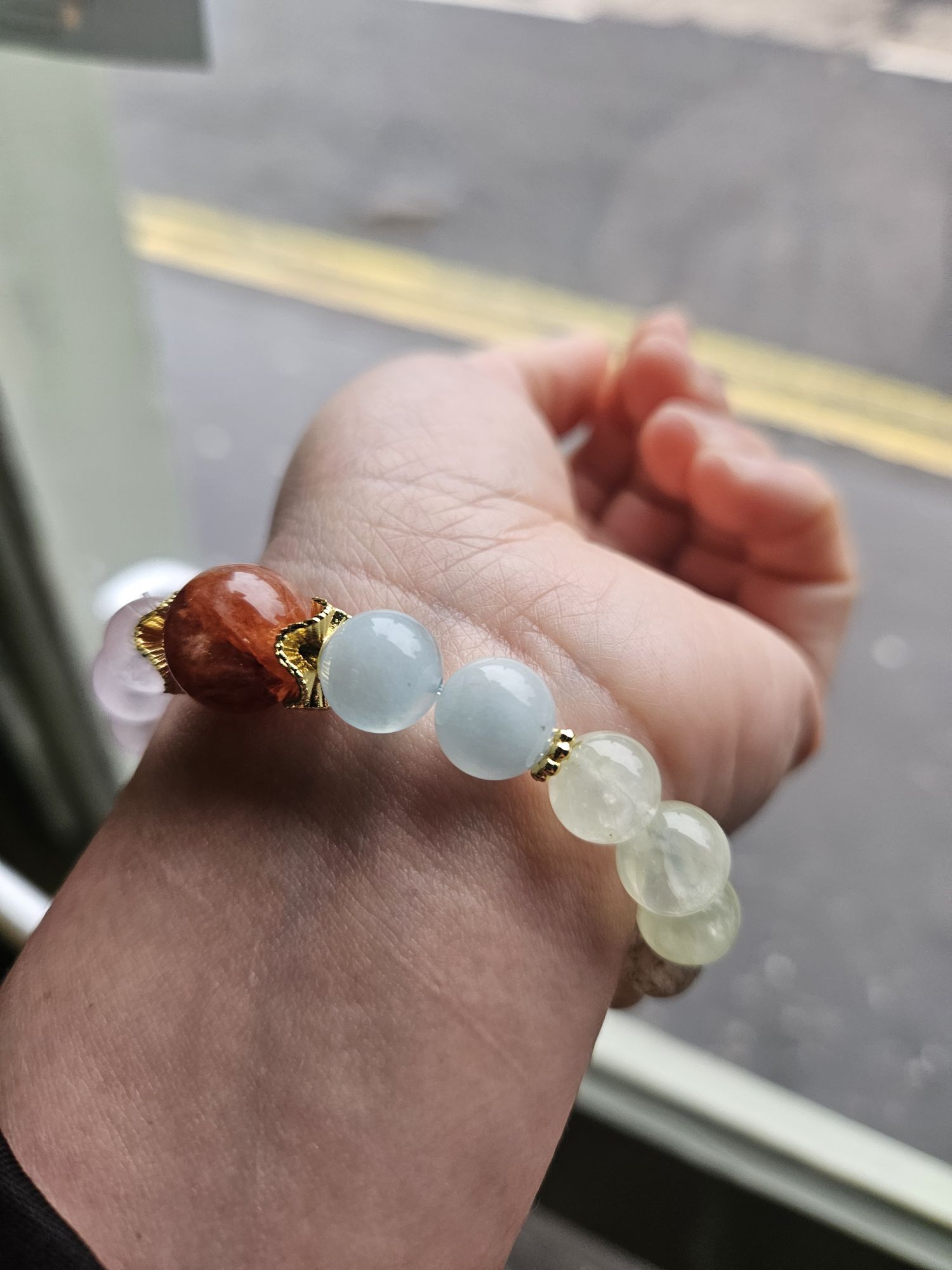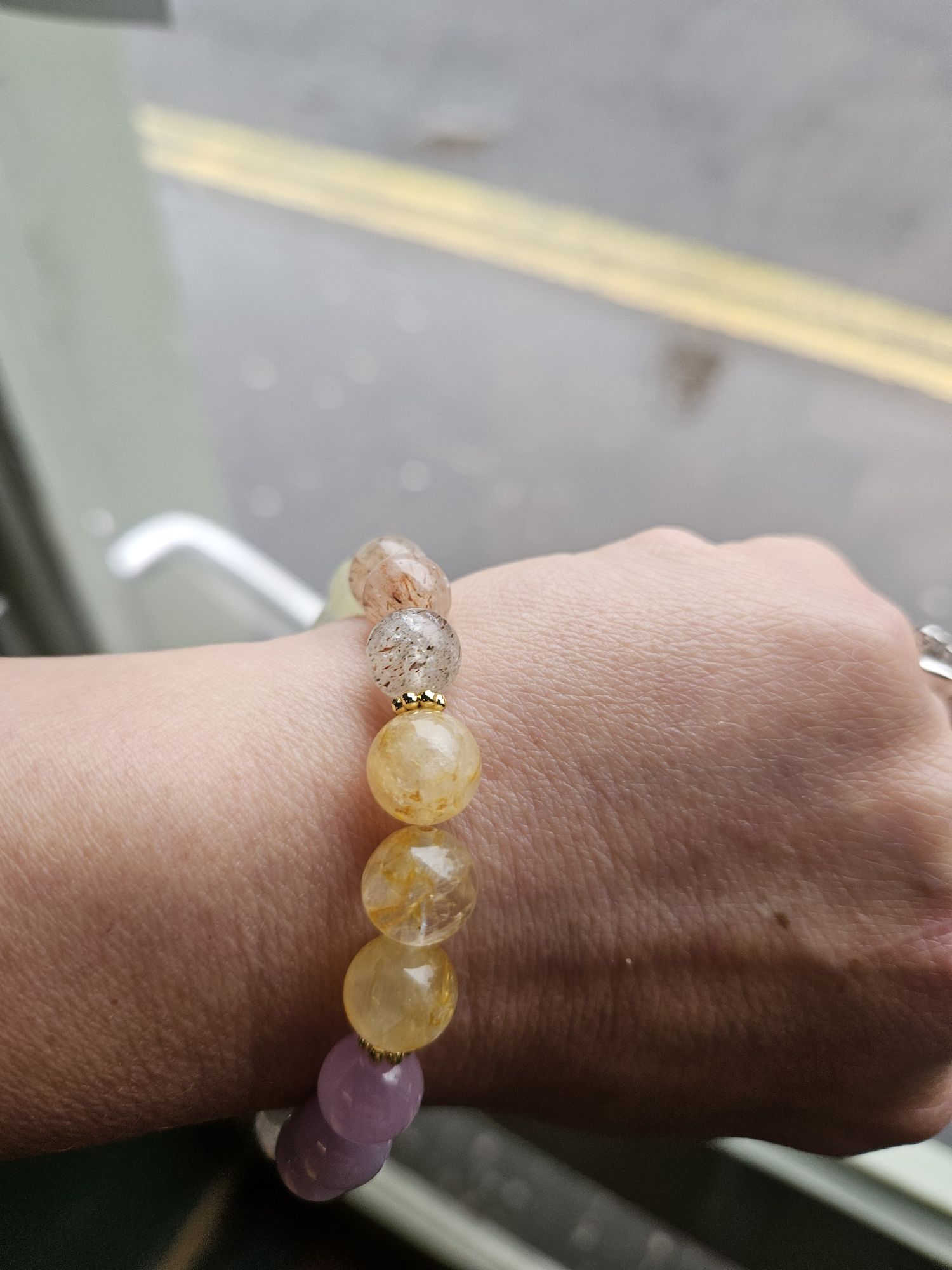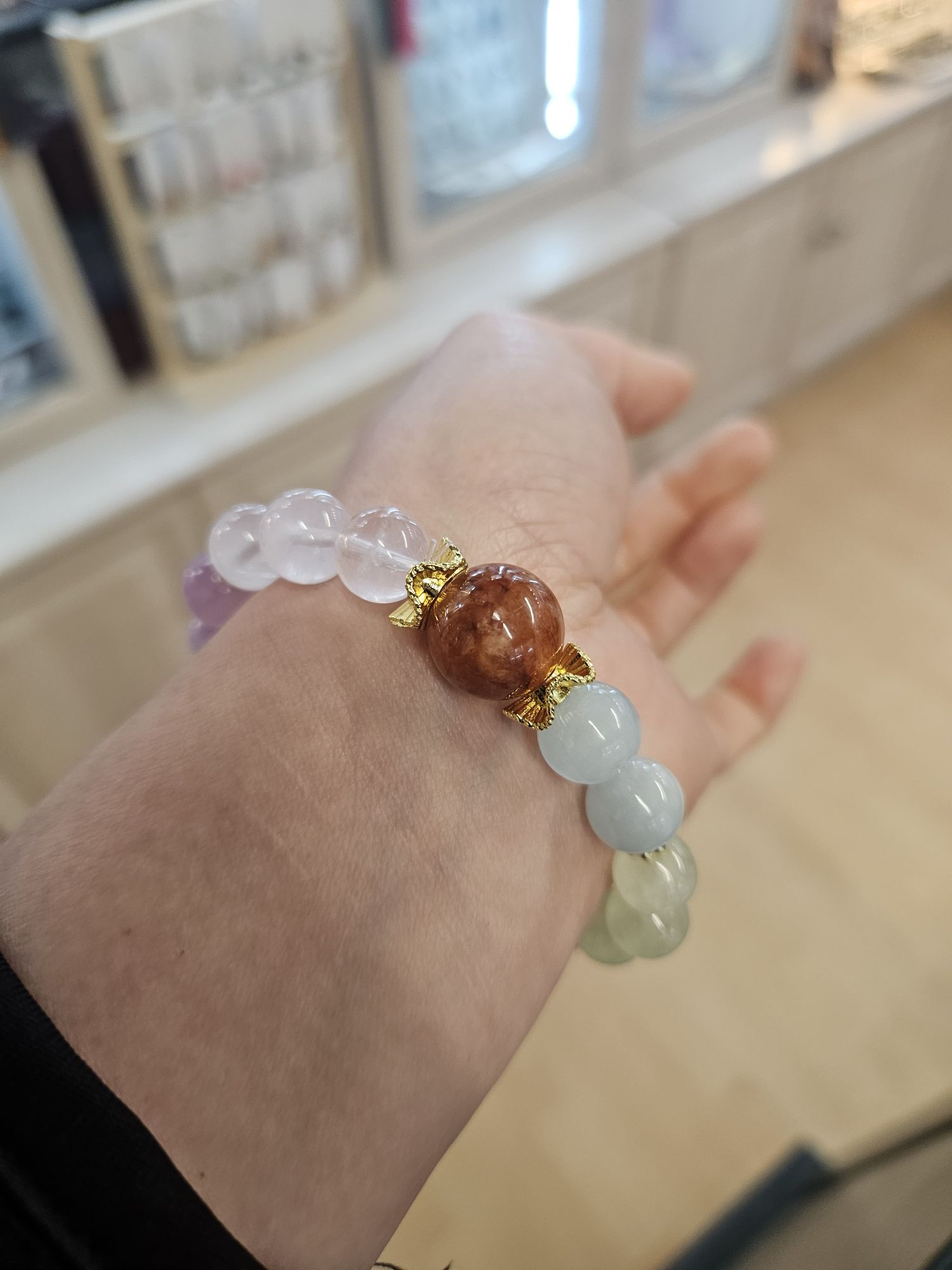 Consisting of 9 to 10mm beads using Aquamarine, Peridot, black Super Seven, Citrine, Kunzite, Rose Quartz and a 13mm red Hematoid quartz.