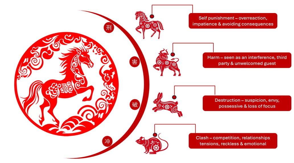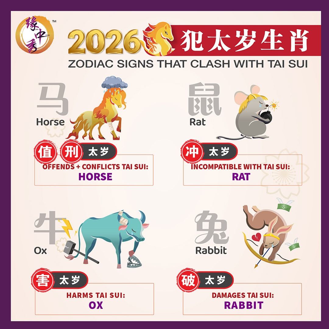 The zodiac animals that will conflict with the tai sui in the Year of the Fire Horse are Horses, Rats, Oxen and Rabbits.