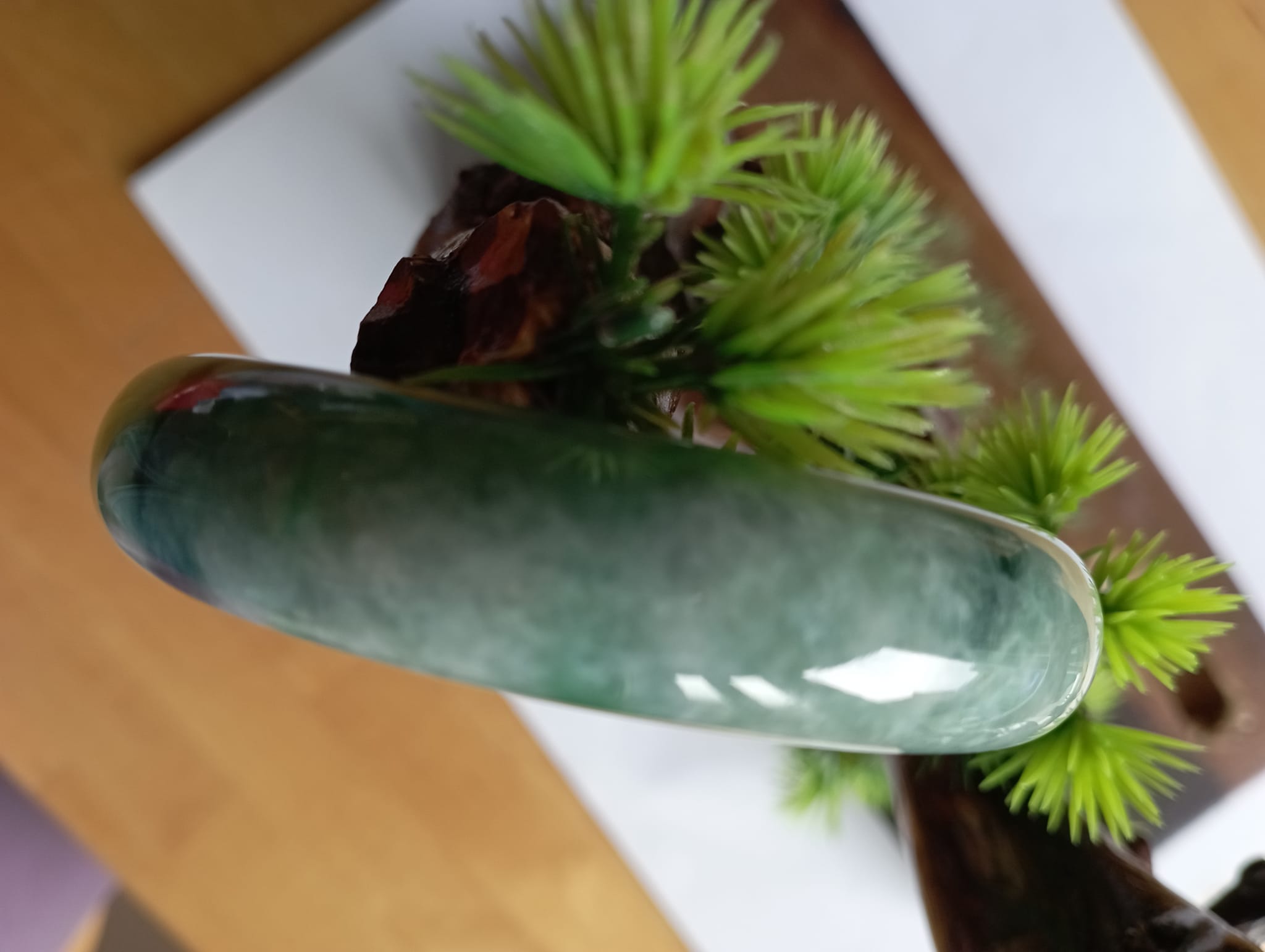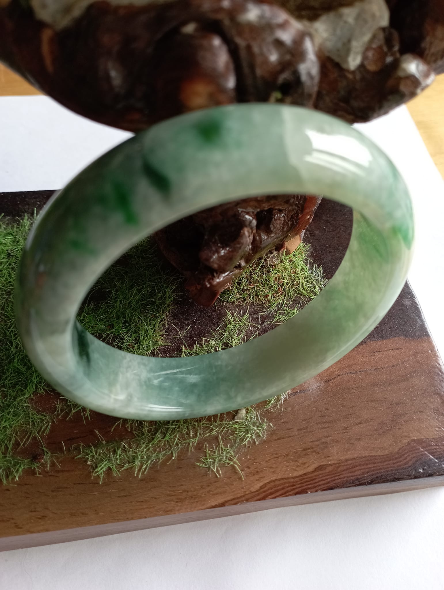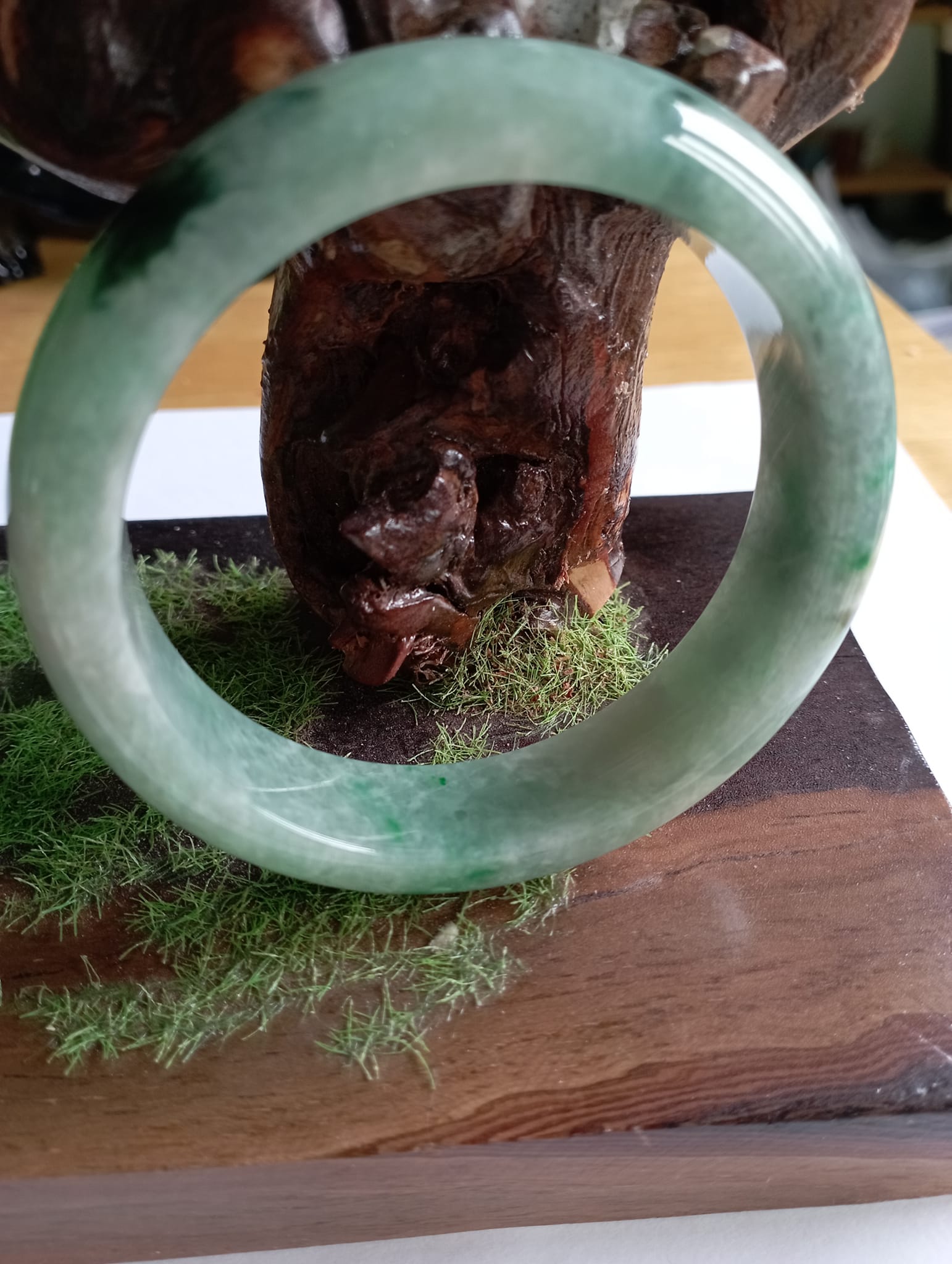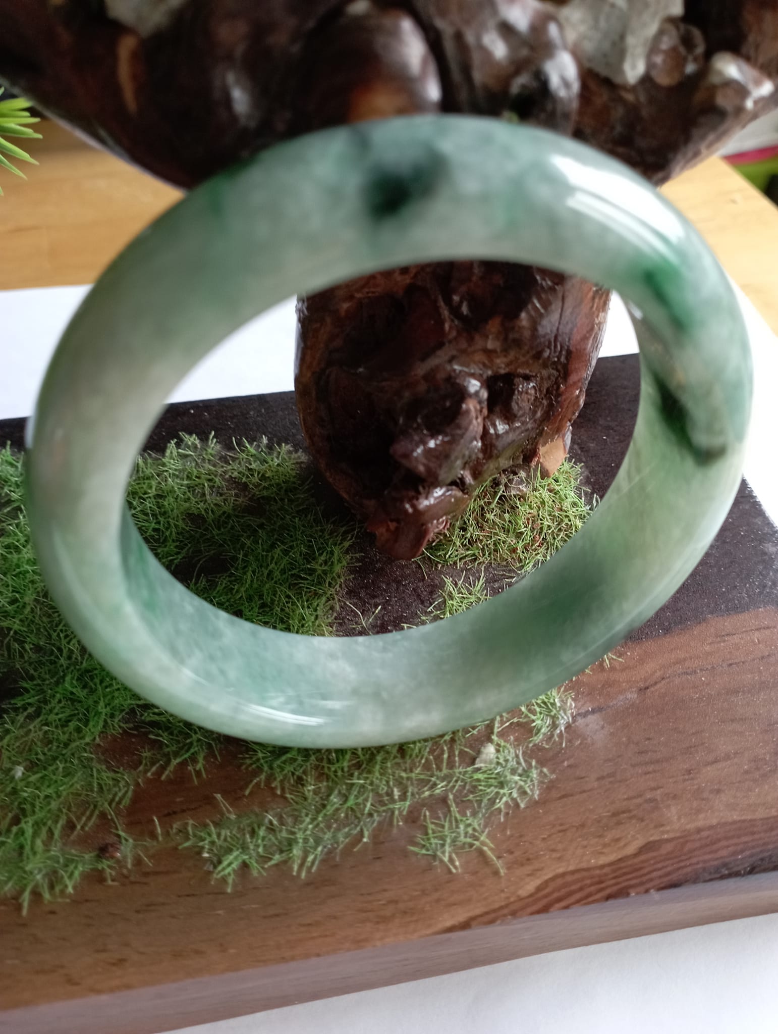 A lovely icy green jadeite bangle with gorgeous blooms, measures 60 X 15.6 X 8.5mm weighing 81.54g. There is an internal crack which does not affect usage at all. Part of the charm of a natural stone. Without the internal crack, the selling price would be at least £200 for this gorgeous colour!!